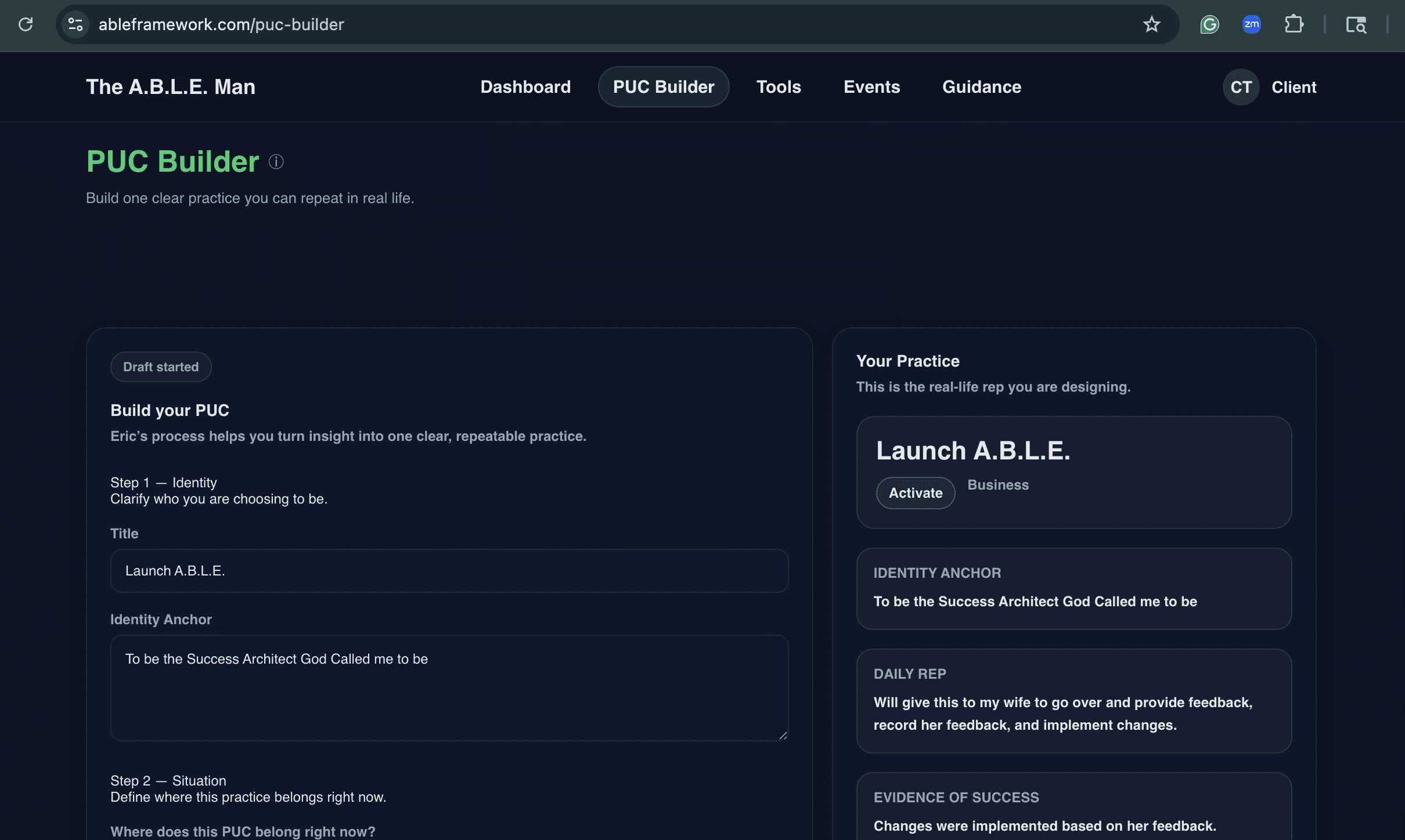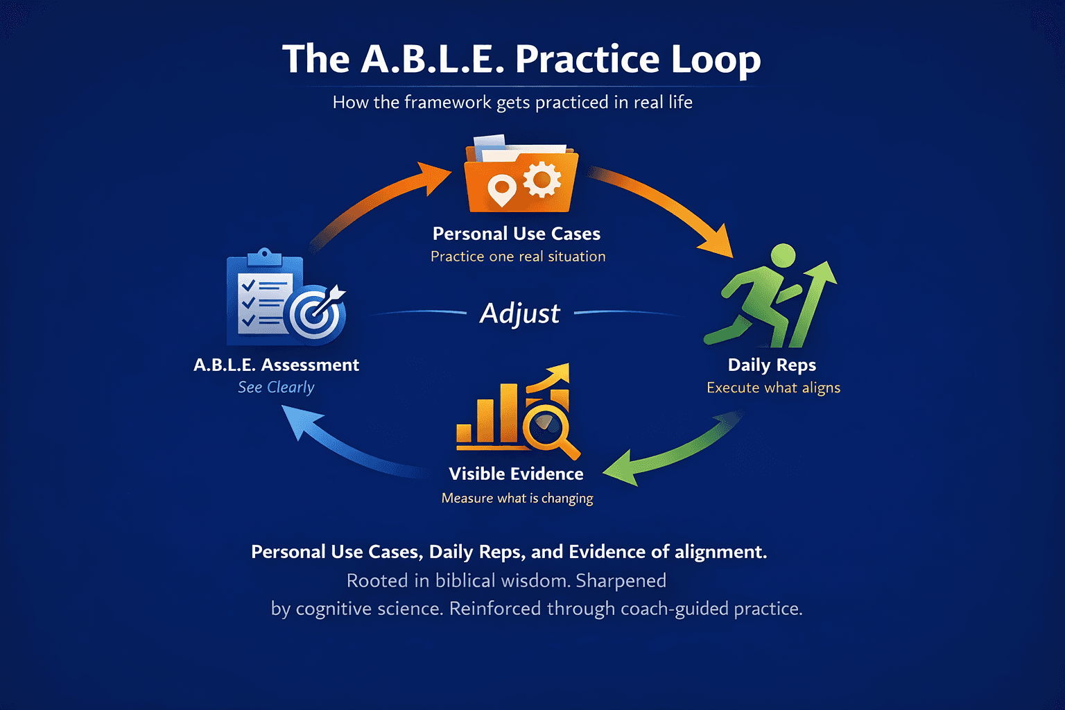 A.B.L.E. is practiced through Personal Use Cases, daily reps, evidence, and guided adjustment. One real situation becomes a structured practice until the pattern changes and the proof is visible.