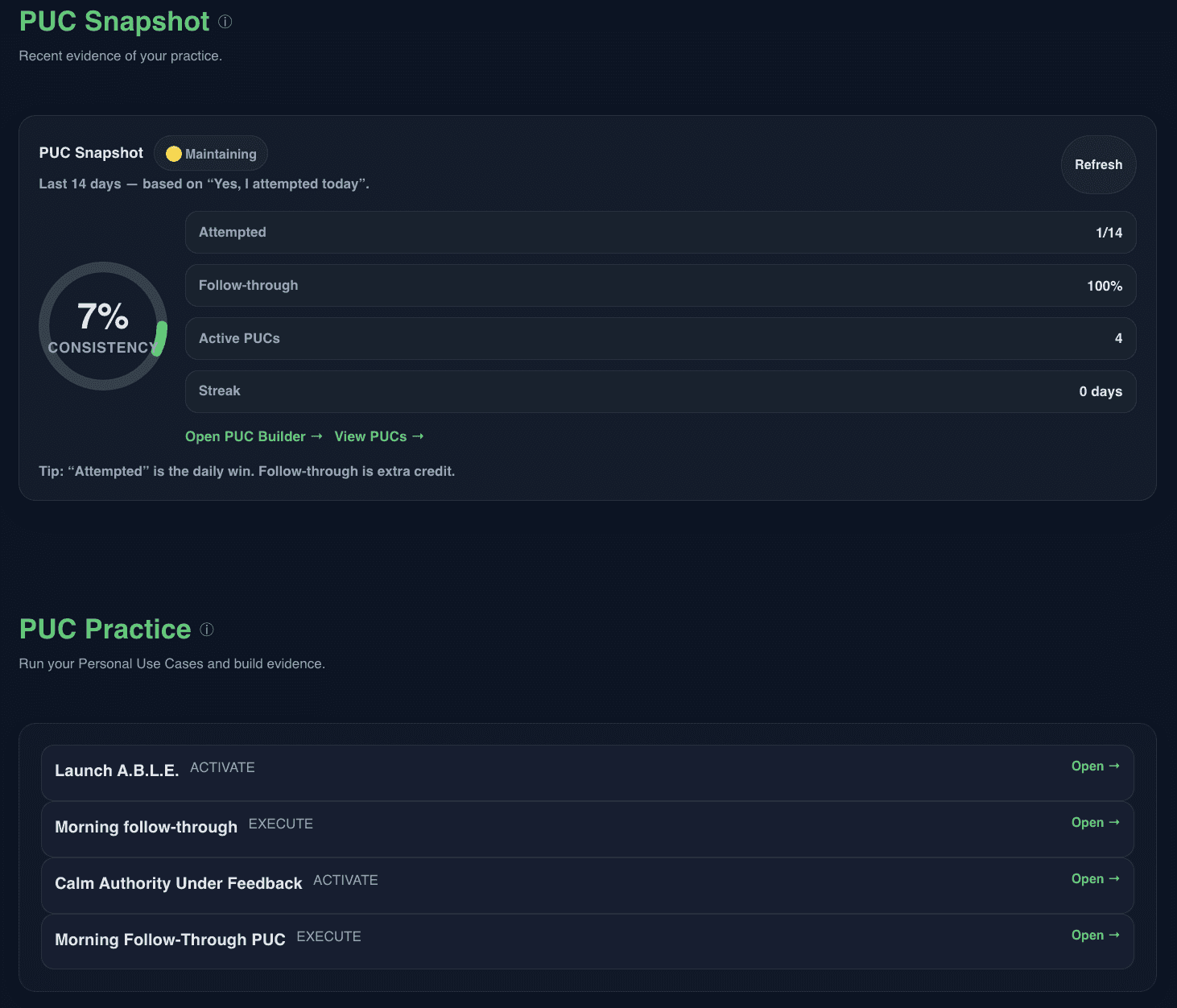 Each week the Command Center surfaces what matters now: your current focus, active Personal Use Case, and today’s rep. Guidance is delivered through Focus, Clarity, and Next Step. Tools appear when they serve the work. Check-ins keep the practice honest. This is where belief is trained into behavior.