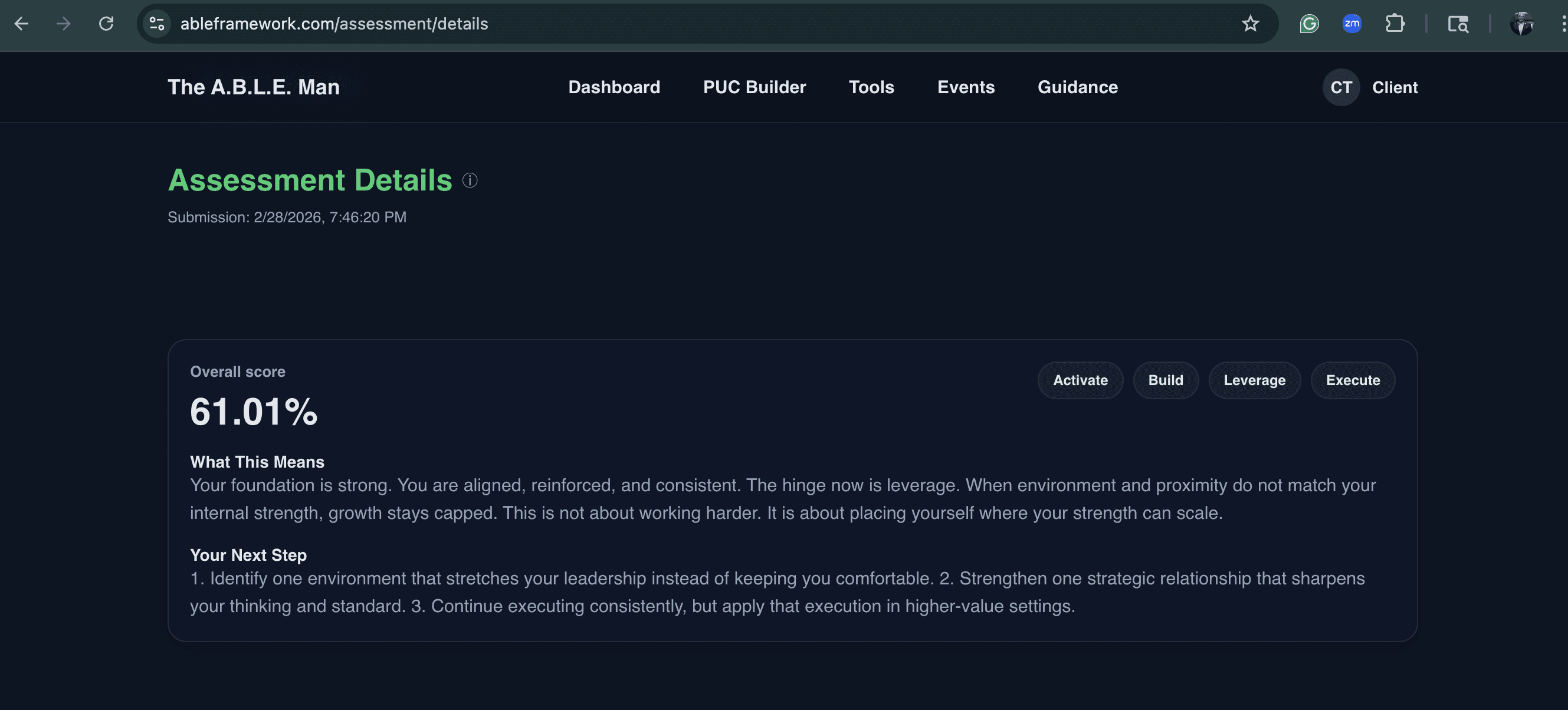 Every journey begins with the A.B.L.E. Assessment. Your Command Center shows your overall score, domain breakdowns, and a written interpretation of the pattern beneath the behavior. From there the Success Architect identifies the first hinge and sets direction.