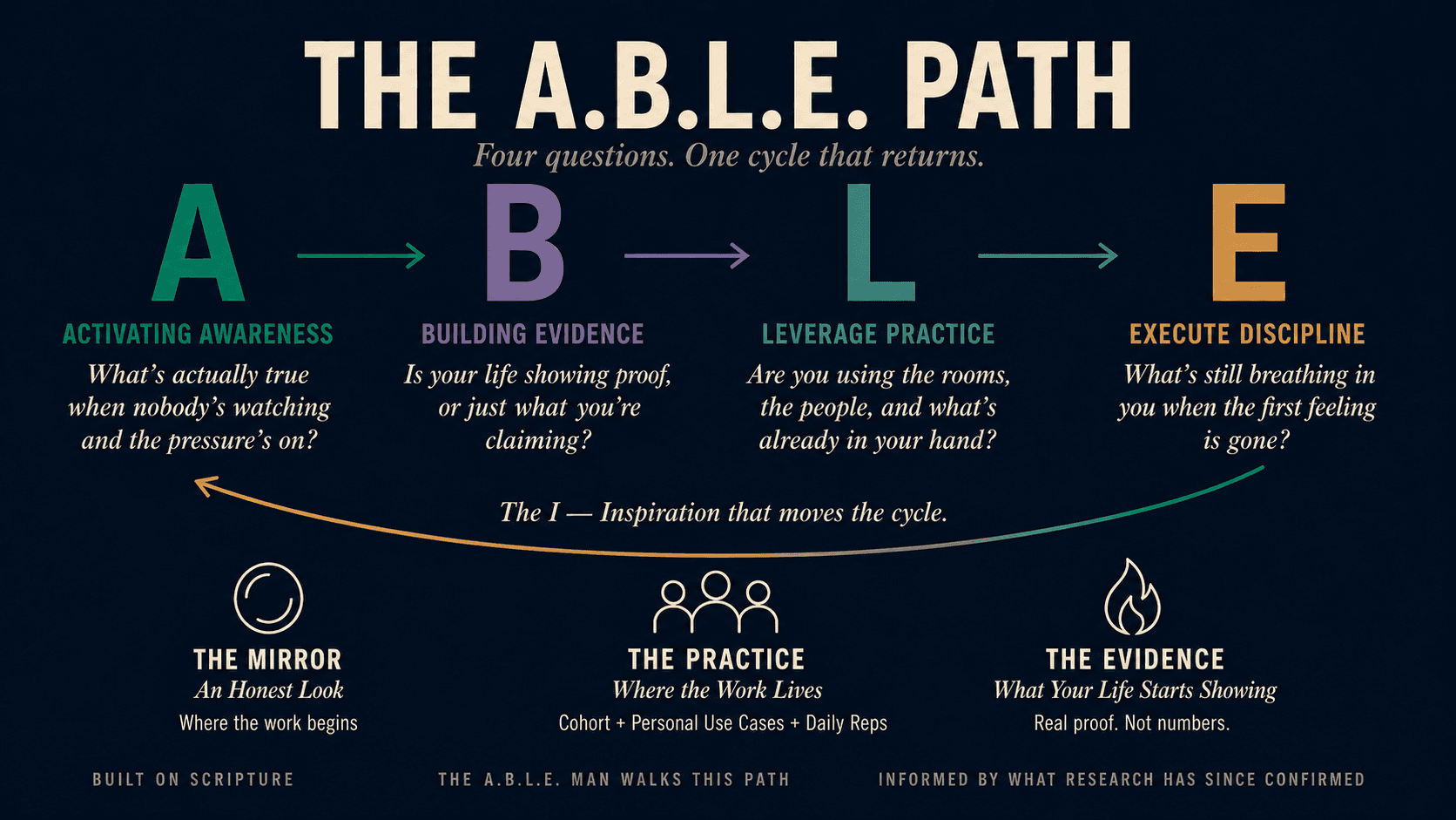 A.B.L.E. is a formation practice for men. Built on Scripture, informed by what research has since confirmed. The deep work, rendered simple. It meets a man where he is and shows him what's actually governing the response he keeps making under pressure.